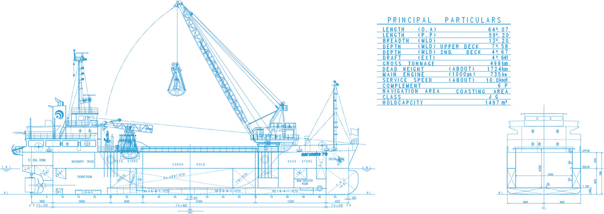 | 船艙寸法 | L21.00 x W10.20m x H6.99m = 1,497㎥ |