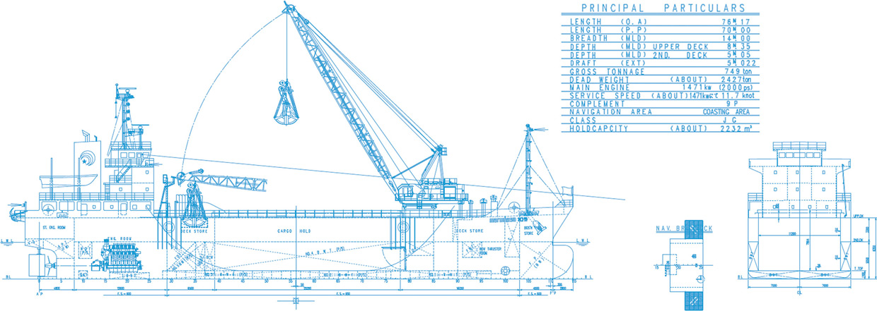 | 主要寸法 | 全長LOA 76.170m Lppm 70.00m 全幅B 14.00m 深さ D/d 8.35/5.05m |