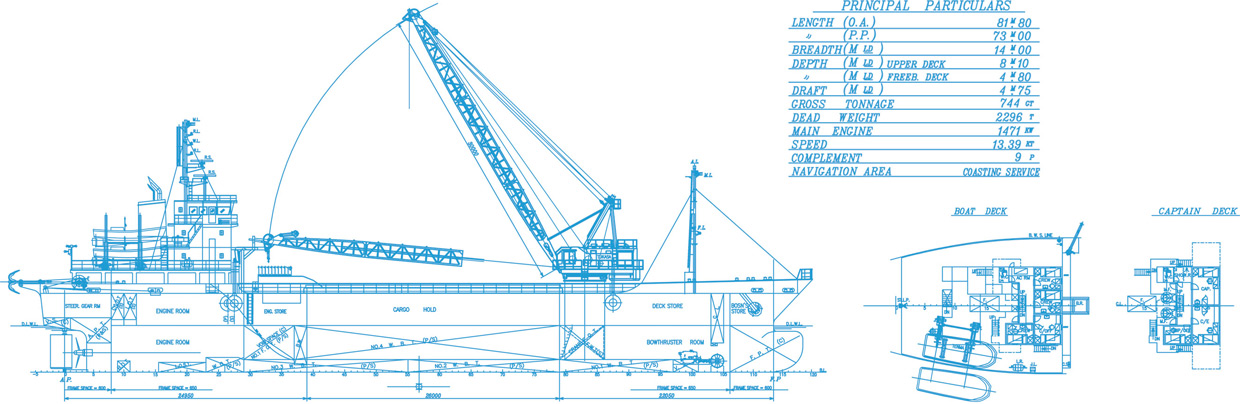 | 主要寸法 | 全長LOA 81.80m Lpp 73.00m 全幅B 14.00m 深さ D/d 8.10/4.80m |